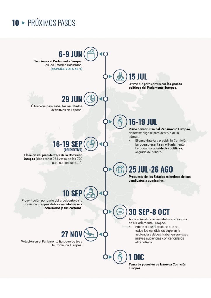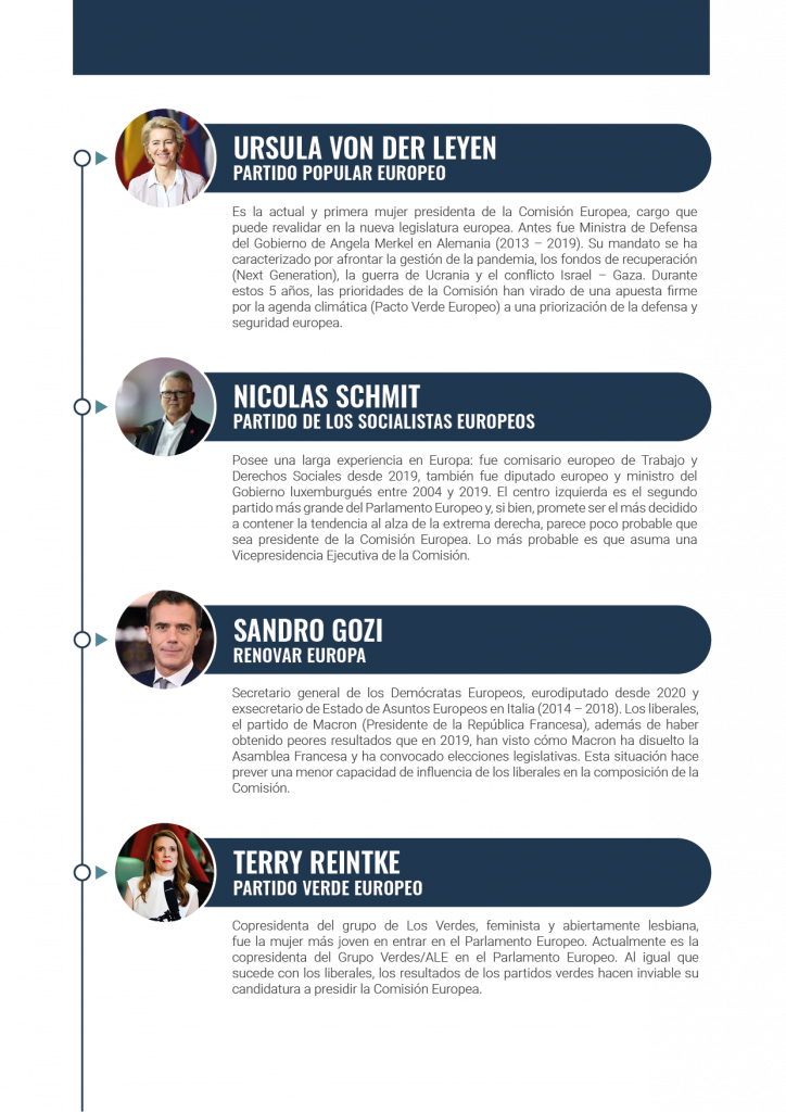 Tras las elecciones del 9 de junio, los países de la UE nominarán a un candidato o candidata al cargo de la presidencia de la Comisión Europea (spitzenkandidat), para lo que deben tener en cuenta los resultados de las elecciones. Es el momento en el que todos los equilibrios de las fuerzas políticas, de género y de representatividad geográfica se han de poner en juego para nombrar a la persona que presidirá la Comisión durante los próximos cinco años.