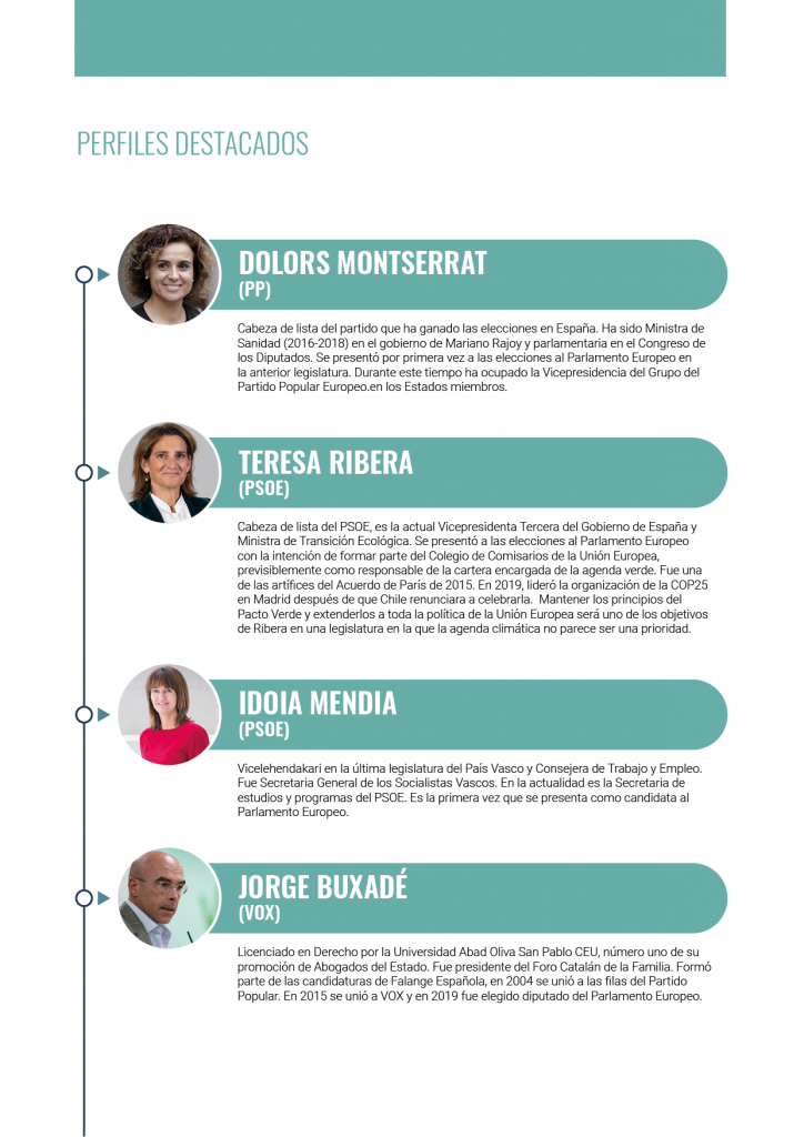 - Partido Verde Europeo (52 europarlamentarios).Fundado en 2004, proviene de la fusión de 32 partidos ecologistas nacionales de 29 países de Europa. Obtuvo sus mejores resultados en 2019 aupados por el auge de las manifestaciones ecologistas de jóvenes empujados por el liderazgo de Greta Thunberg. Si bien, en España su referente es EQUO los verdes, está por ver si los tres parlamentarios de SUMAR deciden ubicarse en este espacio político. La bajada de los verdes en Alemania y Francia les harán perder influencia en el nuevo Parlamento Europeo y previsiblemente la agenda climática pierda ambición frente a otras políticas más vinculadas a la defensa, seguridad y competitividad.