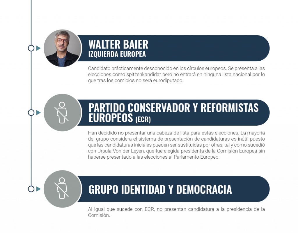 A la fecha de elaboración de este informe, los partidos representados en los siete grupos políticos del Parlamento Europeo han designado a las siguientes personas como candidatos a la presidencia de la Comisión Europea.